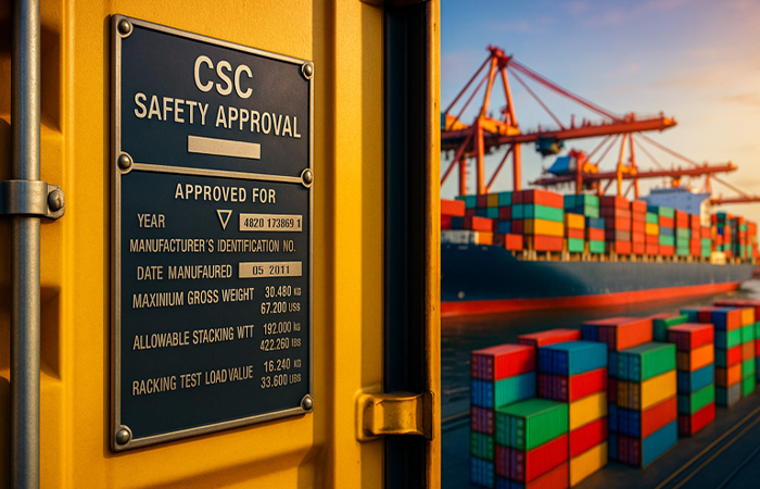 Every single shipping container must have a valid CSC (Container Safety Convention) plate; think of this as an international passport. Fixed to the container door, this metal plate is proof that the box meets all global safety standards for structural strength and handling.